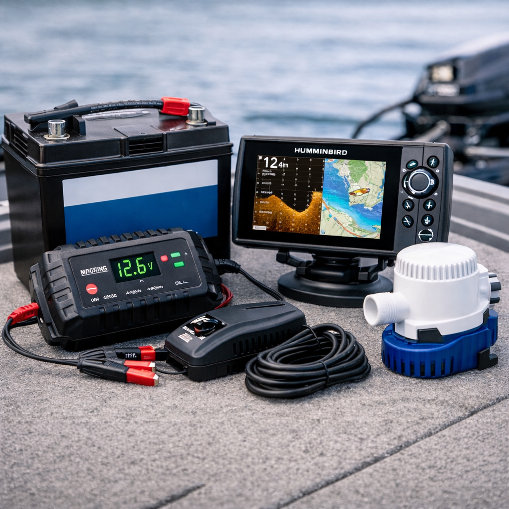 Moderne Bordelektrik für dein Boot. Batterien, Akkus, Ladegeräte, Solarpanels, Batterieboxen, Pumpen und Navigation für Angel- und Freizeitboote.